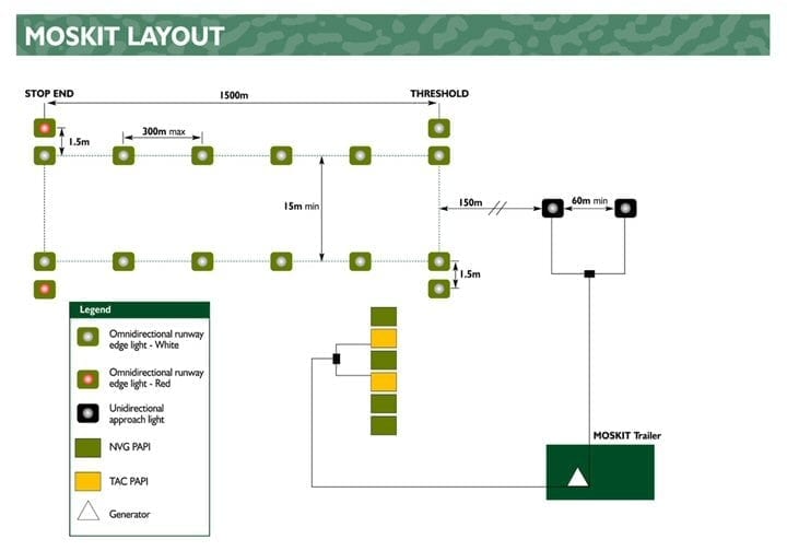 A 1500m Minimum Operating Strip as defined by NATO STANAG 3534. NVG compatible battery powered portable edge lights are spaced at 300m along the runway edge with generator powered omnidirectional approach lights powered from the MOSKIT trailer. Battery powered, NVG compatible PAPIs and generator powered visual tactical PAPIs, also powered from the MOSKIT trailer when required, are deployed in a wing bar on the port side of the runway approach.