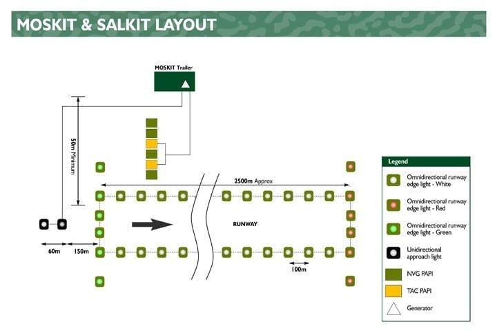 MOSKIT and SALKIT used to form a 2500m tactical runway with edge lights spaced at 100m