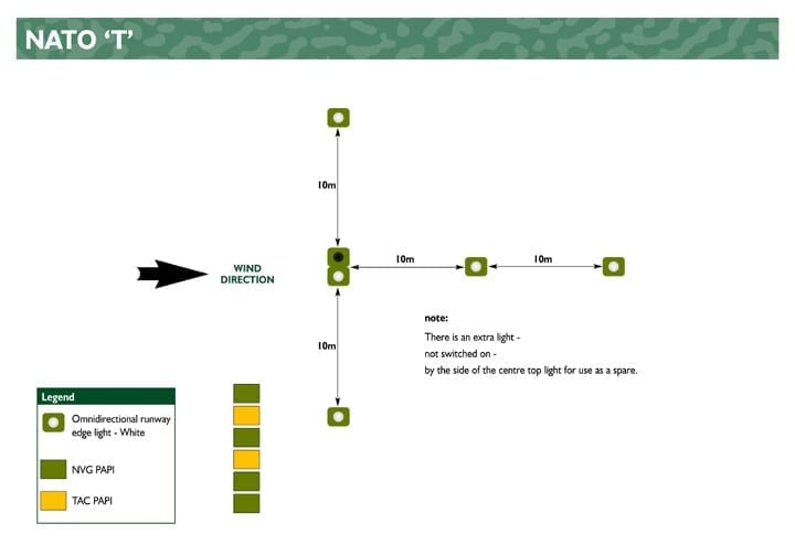 The NATO T provides landing point guidance and is the configuration most used by NATO members for tactical operations. Five helipad landing lights are deployed to provide directional guidance allowing the helicopter to land in one of the quadrants.