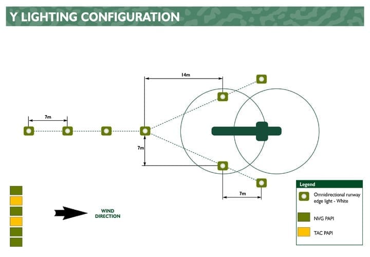 This Y configuration uses seven helipad landing lights and is an alternative layout favoured by some international armed forces. Again the landing lights can be deployed to give guidance relating to the direction of approach.