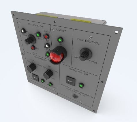 Console mounted Bridge Panel incorporating red and green Deck Status, or red, amber, green Pilot Information Light and Wave Off activation switch. Other control functions for the Homing Beacon and Obstruction/Obstacle Lighting can be added if required.