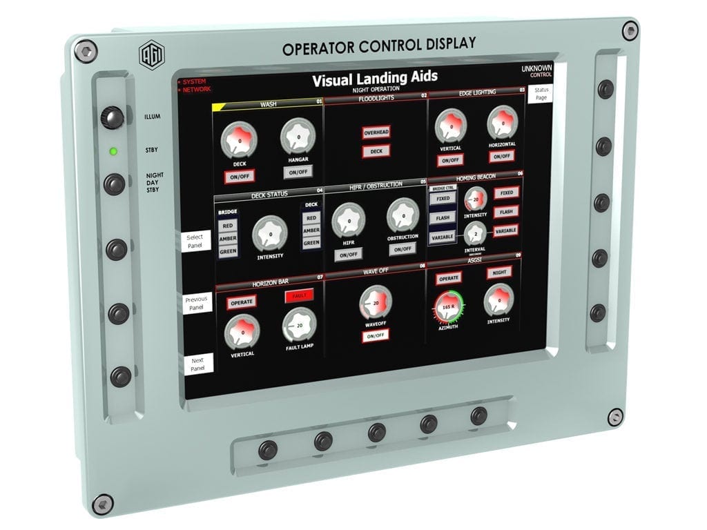 The OCD is a 15” TFT control console operating from the 115 – 230V 50/60Hz ships supply, and with a number of “soft keys” to access on screen menus for the HELIVAS equipment control. The OCD will communicate with the Network Switch via Ethernet messages to effect lighting control. The OCD will meet MIL STD 461E.